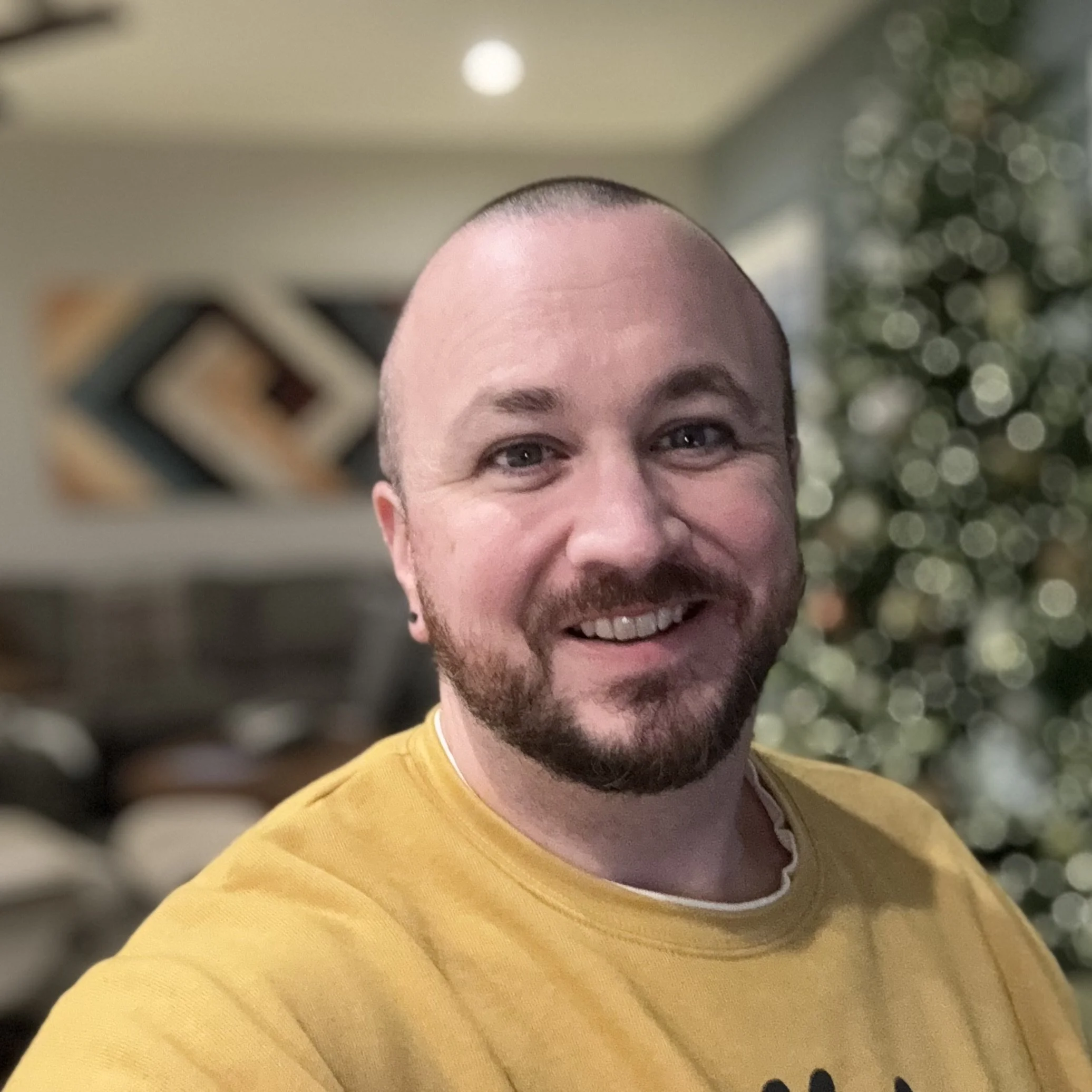 A portrait-mode selfie of me in front of our Christmas tree