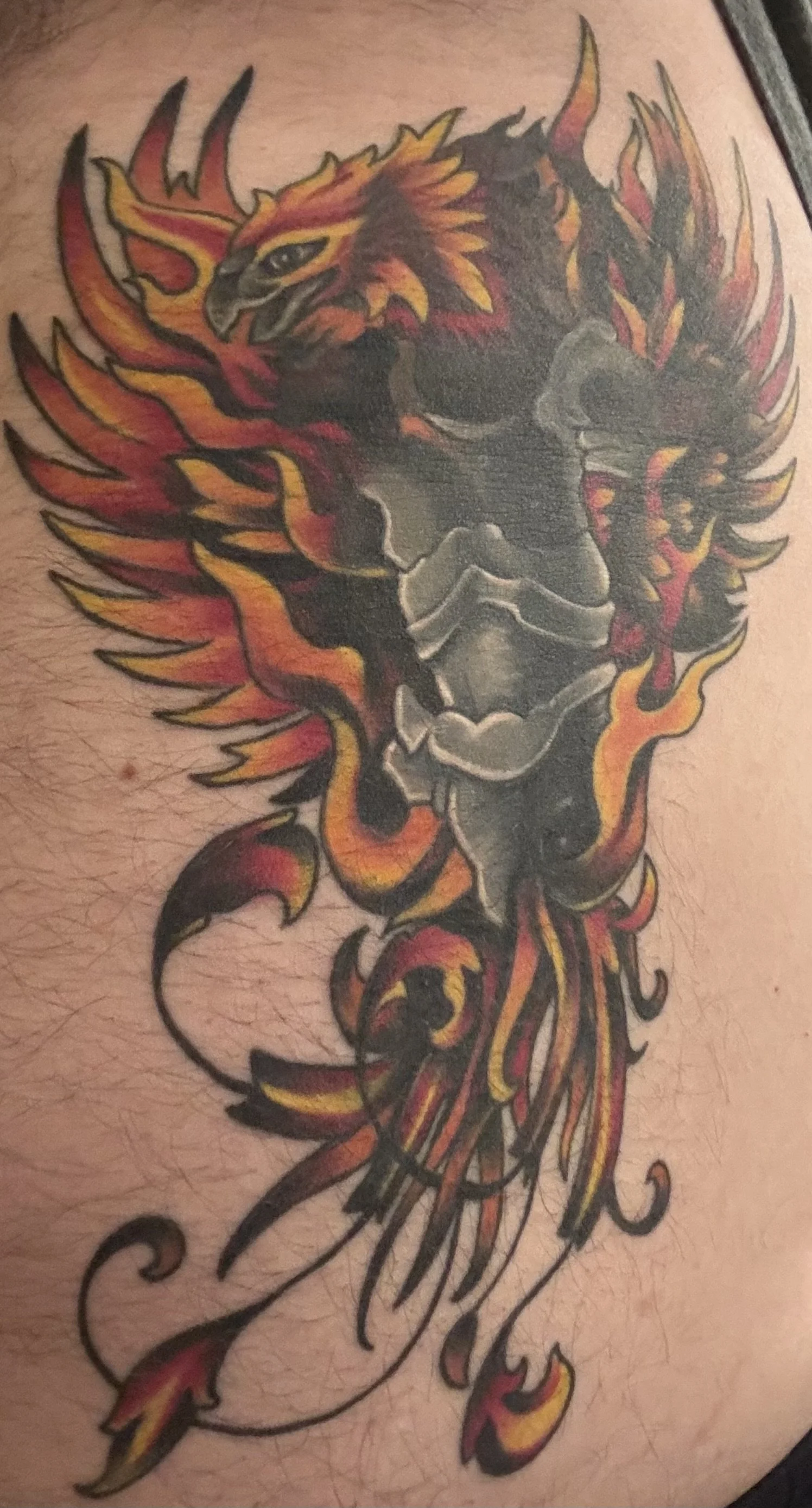The books also talk about confronting oppressive systems, like the government and religious institutions. Arthur’s phoenix tends to come out A LOT when he is confronted with these oppressive people. As we are faced with extreme oppression coming from our government right now, I can think of no better tattoo to have than this phoenix as a symbol of fighting back.