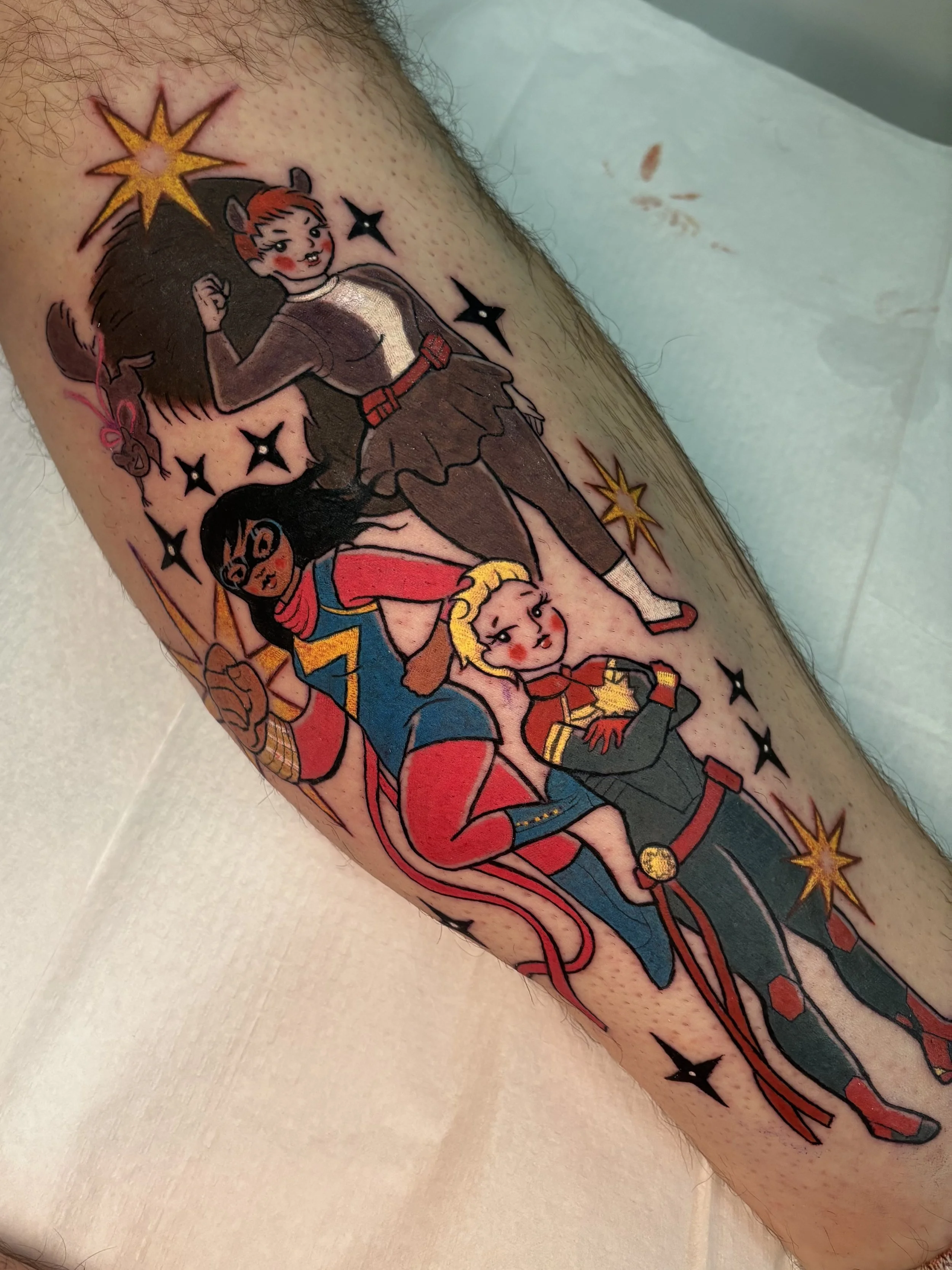 A photo of my new tattoo of Squirrel Girl, Ms. Marvel, and Captain Marvel done by Melissa Martell at Glass Cat Tattoo in Cleveland, OH.
